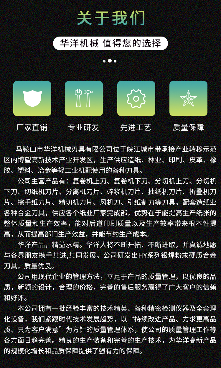 馬鞍山市華洋機(jī)械刃具有限公司 版權(quán)所有 免責(zé)聲明 皖I(lǐng)CP備2022002938號-1 營業(yè)執(zhí)照